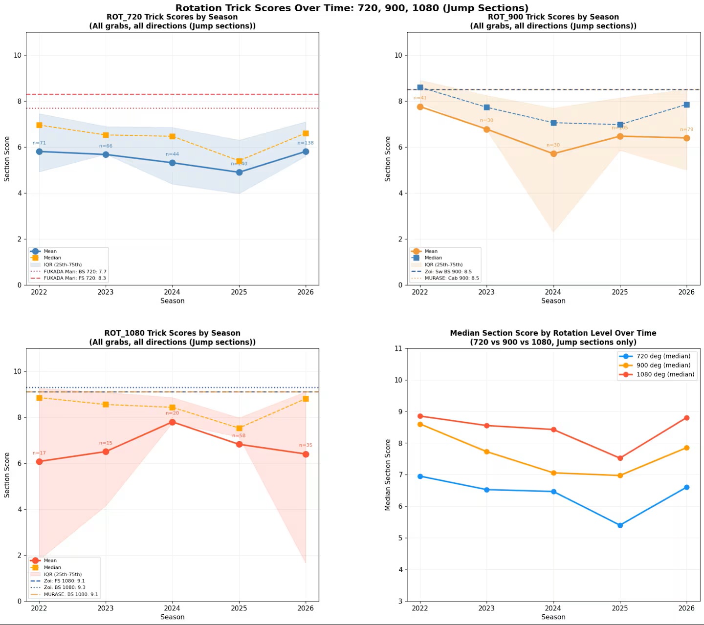 To check the medal finish, Owl AI created a data set to look back at the past five years of judging for both 720s and 1080s. What it discovered: The two scores Fukada earned in Milan Cortina on her 720s (7.7 and 8.3, respectively) stood out drastically. The scores on Sadowski-Synnott’s 1080s were also near the peak of scoring for the moves but still very in line historically with the judging from which Owl pulled.