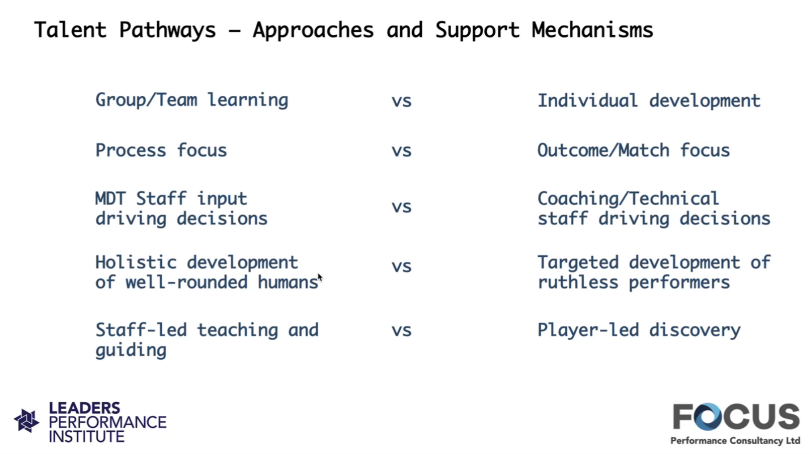 “There’s been a massive growth in talent pathways around understanding the holistic nature of development and the growth in player care, support, psychology support, performance, wellbeing, and education off the pitch. The common question is ‘how do we develop well‑rounded humans?’ And the tension is someone saying ‘but surely it’s just about game performers can we spend all of our time targeting development of that ruthless in‑game performance?’”