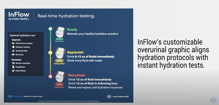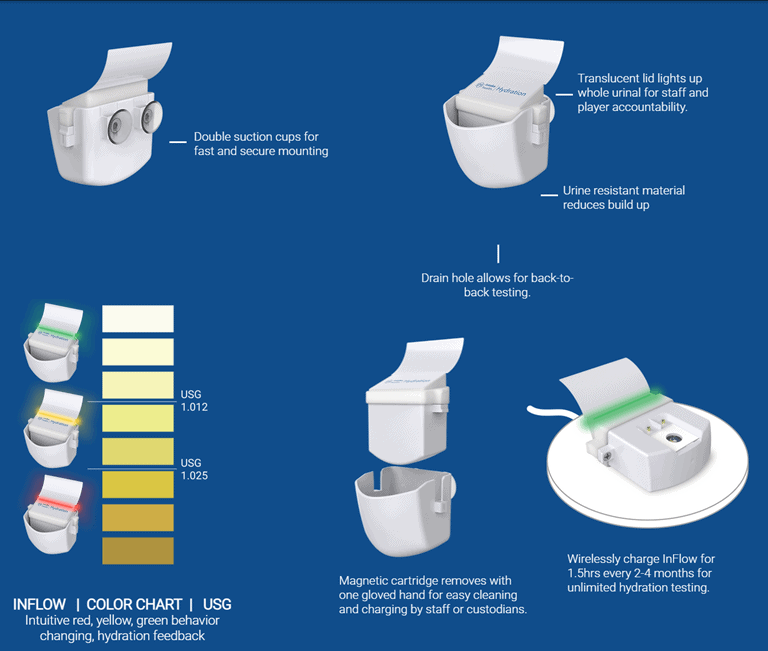 How does your product work? “It’s a physical product called InFlow. You buy it and it measures hydration in real time for users. It’s installed in a urinal in just a couple of seconds with suction cups. You get it out of the box, install it in the urinal by pressing it into the back wall. In the locker room, as athletes are coming in and using the bathroom, they urinate on it and it fills up with a little bit of urine and they instantly get a very bright green, yellow or red indication of their hydration status, along with a graphic that goes over the urinal that tells them the next step depending on what that result is they got.”