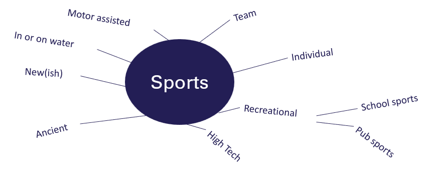 “What mind mapping is very good at doing is getting us to think more broadly,” said Bull. “What we tend to do when we’re being creative is we’ll come up with one or two ideas quickly as you would have been doing there, but then we tend to stay in that same vein of thought. So if I come at this using mind mapping, the first question you ask yourself mind mapping is not what sports can I think of, but what categories. Once you come up with a category, the brain very quickly accesses four to seven ideas.”