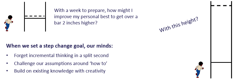 Step change thinking is the idea of setting a very stretching goal and then thinking how that could be possible.