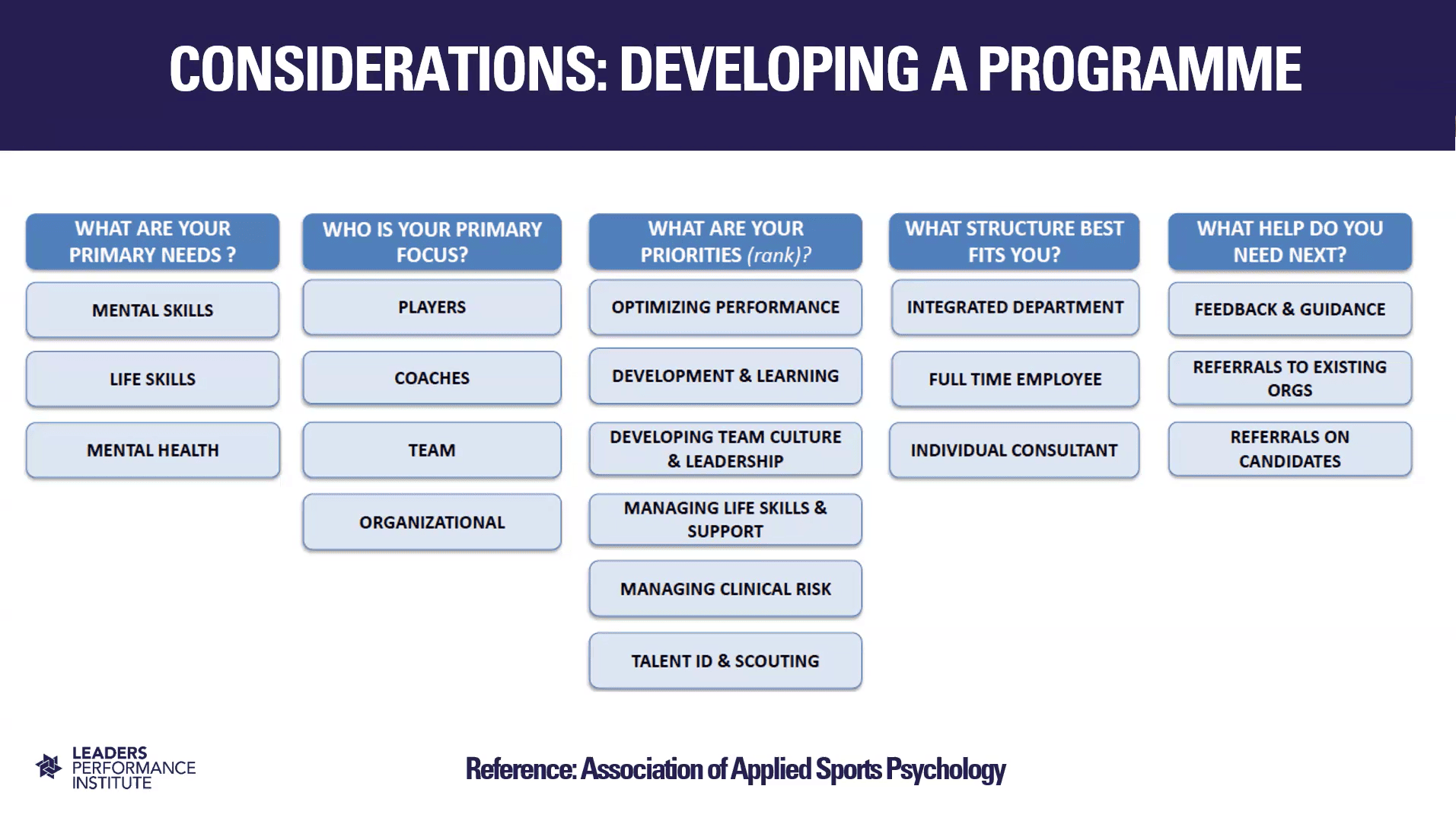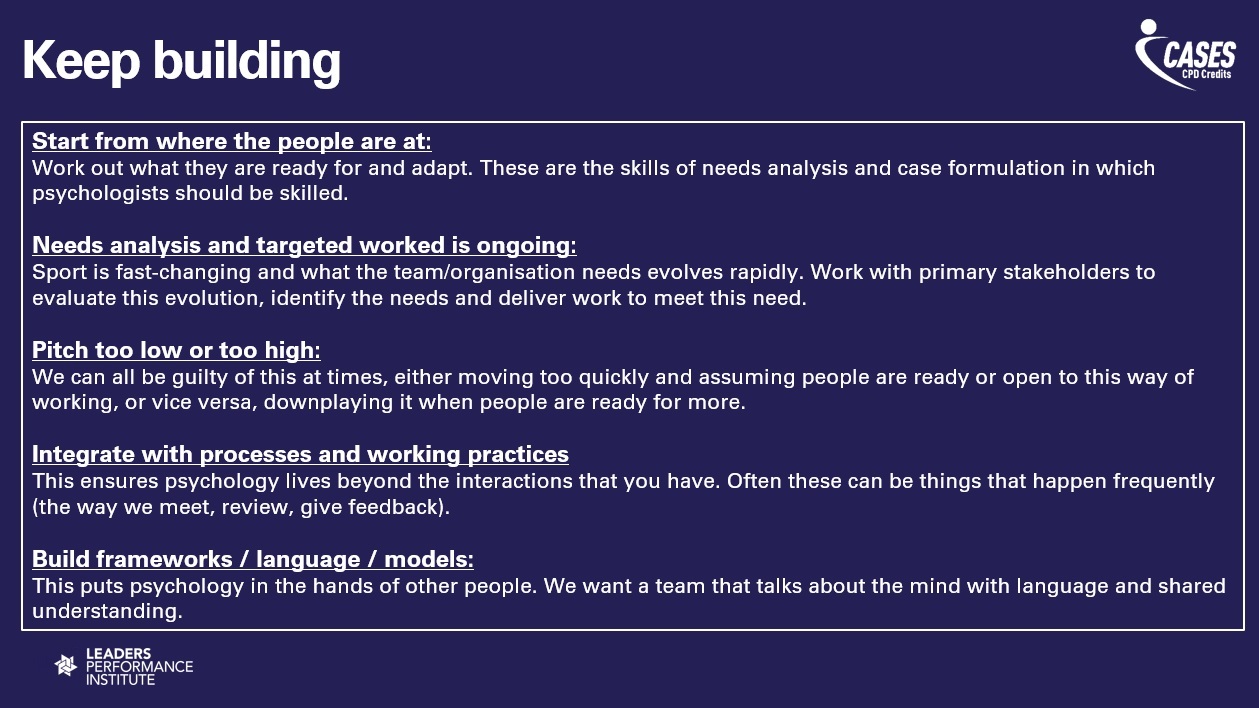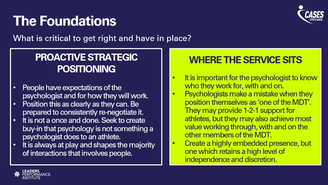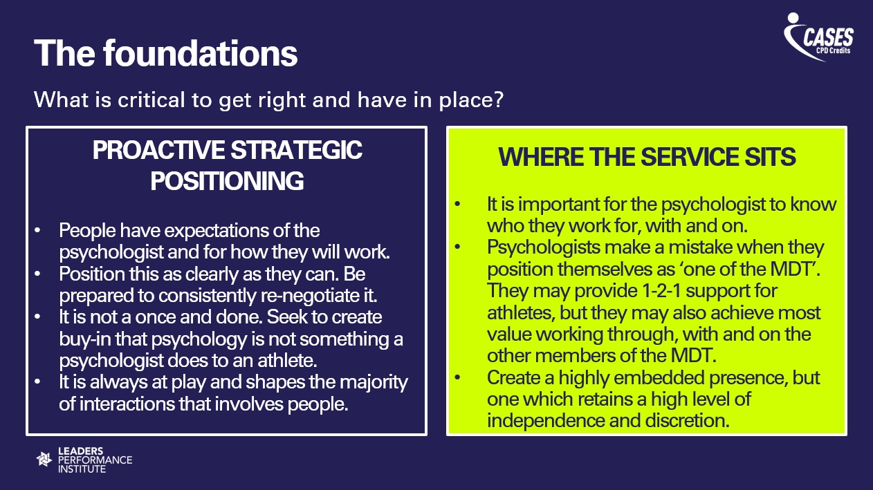 He argued that it is on key stakeholders to manage inductions and help the psychologist to build trust, particularly in environments where they might be unaware of social or sports norms. “It can create havoc and a longer pathway to building relationships,” he added. “The onboarding process can really minimise the downside and accelerate the positives. We underestimate that window.”