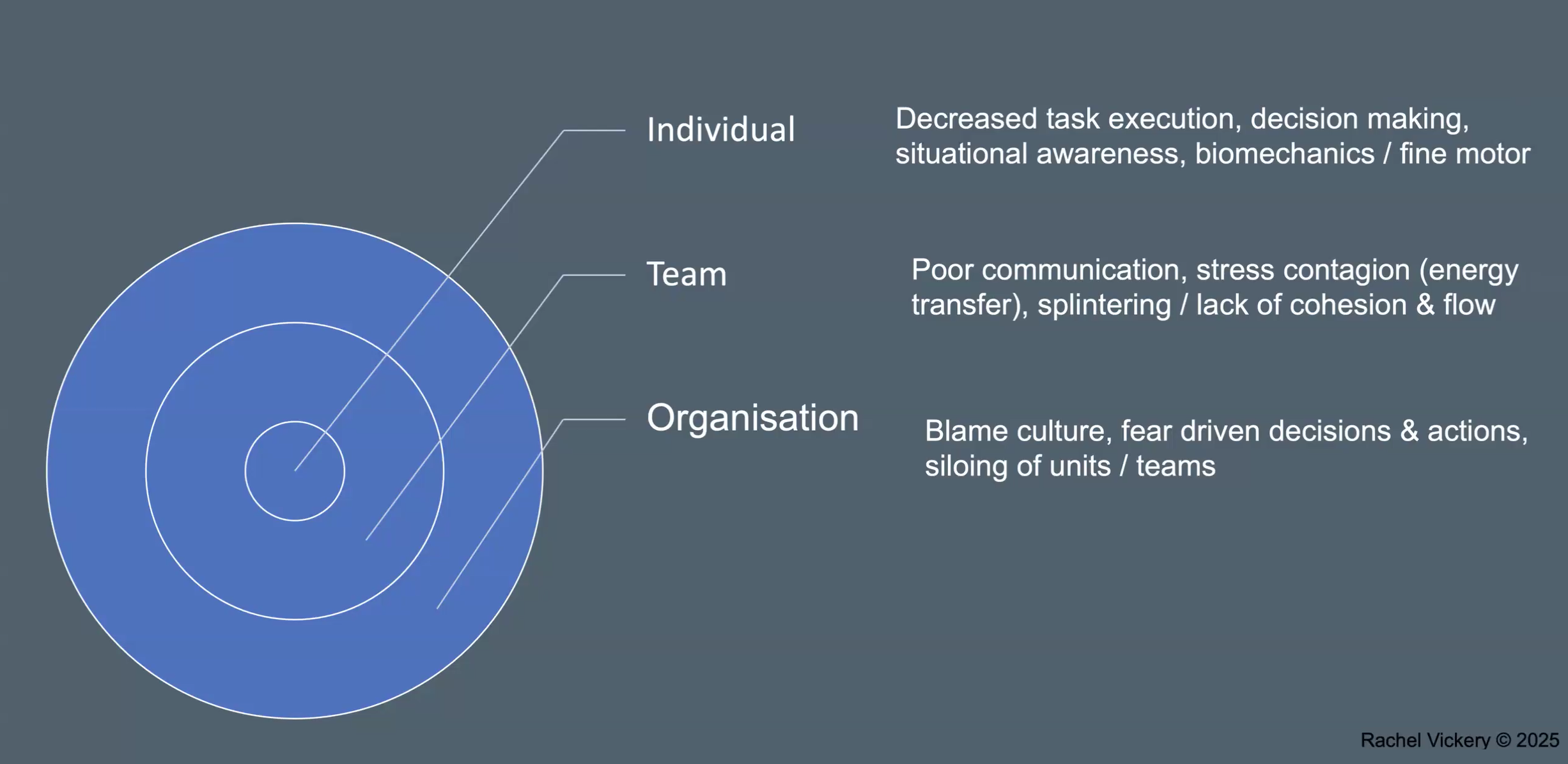 The stressors in question can be personal (e.g. a lack of sleep), organisational (e.g. misalignment), performance-based (e.g. being outside your comfort zone), or physiological (e.g. reduced ability to hear or absorb information).